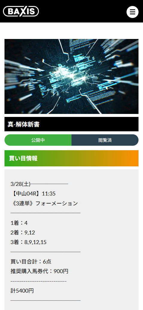 コネクションを活用した関係者情報の収集はもちろんの事、 過去のレース結果 から膨大なデータを抽出し分析を実施。 馬券師が持つ情報から更に何段階もの検証を行う事で常に価値のある情報 を扱う事を可能としております。 競馬歴数十年のベテランの方から知識 の浅い初心者の方まで競馬をお楽しみ 頂けるよう、 バクシスではレースの見 方から馬券の買い方まで柔軟なサポー トを心掛けております。 競馬投資は少ない資本で大きなリターンを得ることが可能なものであり、 大掛 かりな準備や学習は必要ありません。 ハードルが高いと考え、踏みとどまっていては事態は変わりません。 競馬を通して利益を積み重ねたいとお考えなのであればバクシスにお任せください!